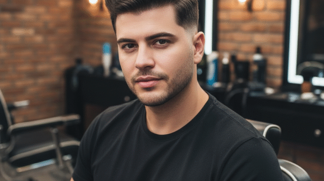 O topete moderno e o quiff concentram o cabelo na frente e no alto, criando uma forma vertical que contraria a redondeza do rosto. O importante é que haja altura real no topo, não só volume horizontal. Quando combinados com fade ou undercut, o efeito de afinar o rosto é imediato. Exigem pomada de fixação média ou forte para manter a forma.